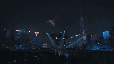 伴着质朴悠扬的日本传统弦乐三味线韵律,20多架无人机编队飞行表演,并配合着音乐变化颜色和图案。