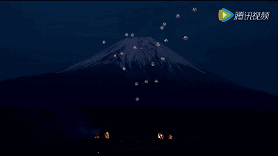 无人机在空中飞出立体动感的画面,16500个LED灯在空中翩翩起舞。如梦如幻,点亮了富士山的夜空。