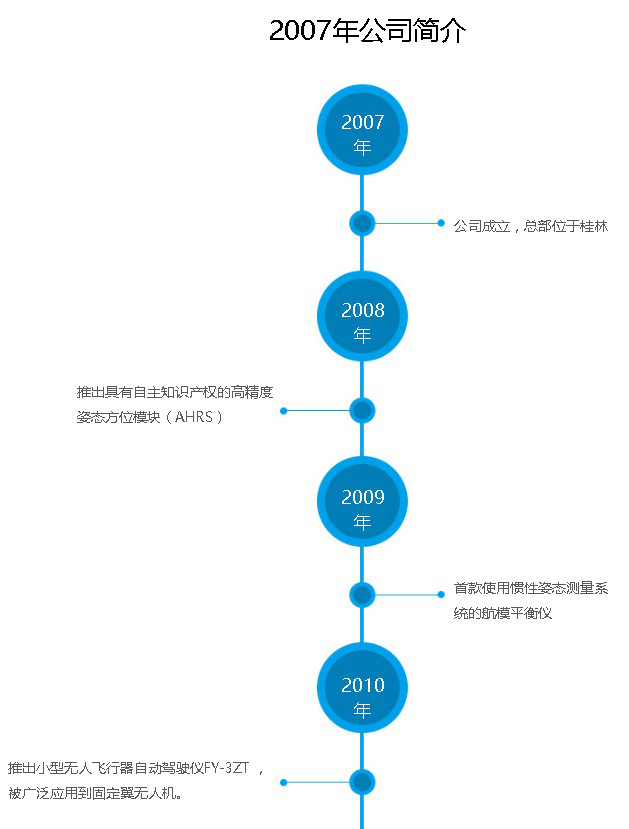 自成立以来,于2008年推出具有自主知识产权的高精度姿态方位模块;于2009年推出了首款使用惯性姿态测量系统的航模平衡仪;于2010年推出了小型无人飞行器自动驾驶仪。在此后的每一年,飞宇科技都用它自身的科技实力,不断地推陈出新。到目前为止的飞宇科技产品,已经有着不小的规模了。
