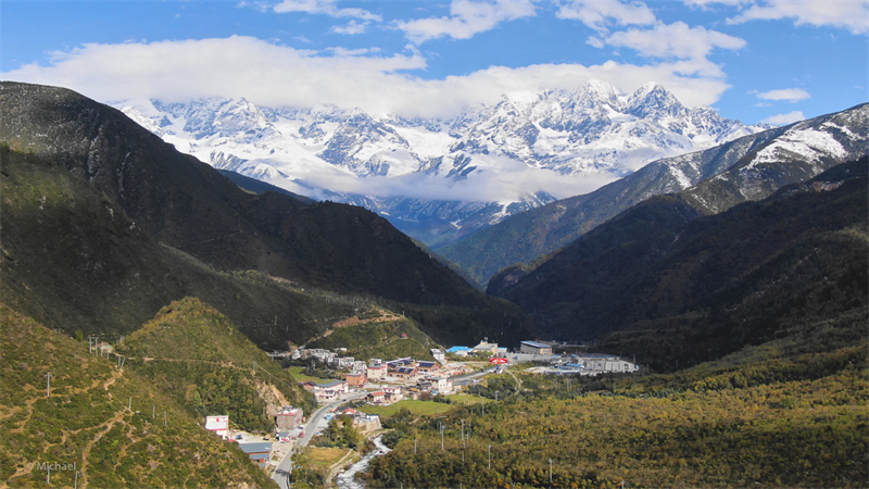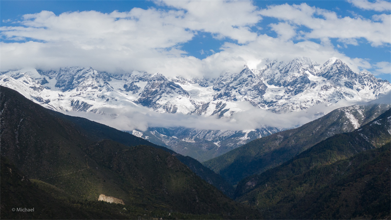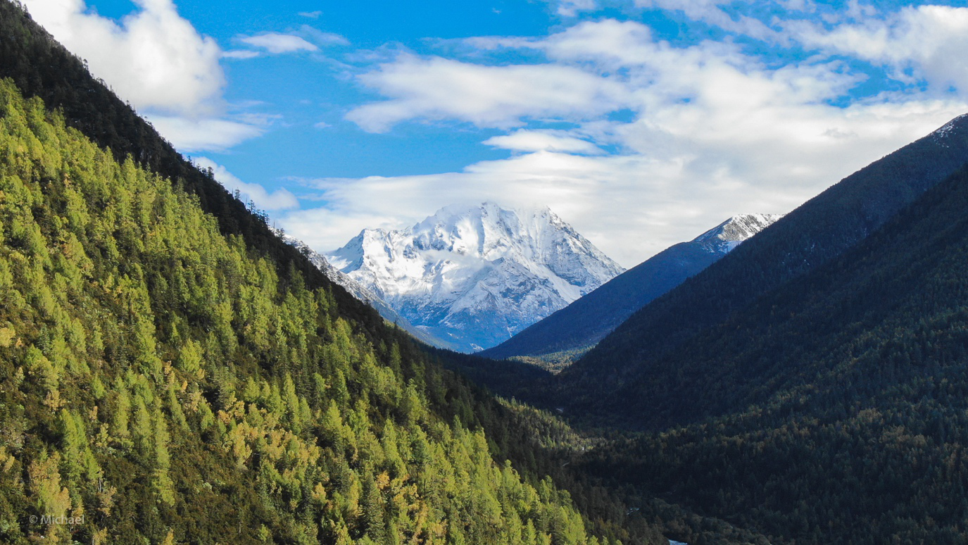 这张照片是我使用M2Z拍摄的雪山,在48mm焦段的帮助下,雪山和山脚的村庄似乎距离比较近,形成了一种人类社会与大自然的强烈对比效果。同样的一个场景下,如果我使用24mm广角端拍摄,效果便是这样的——