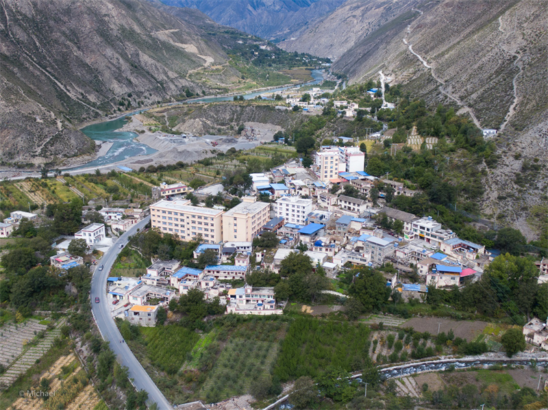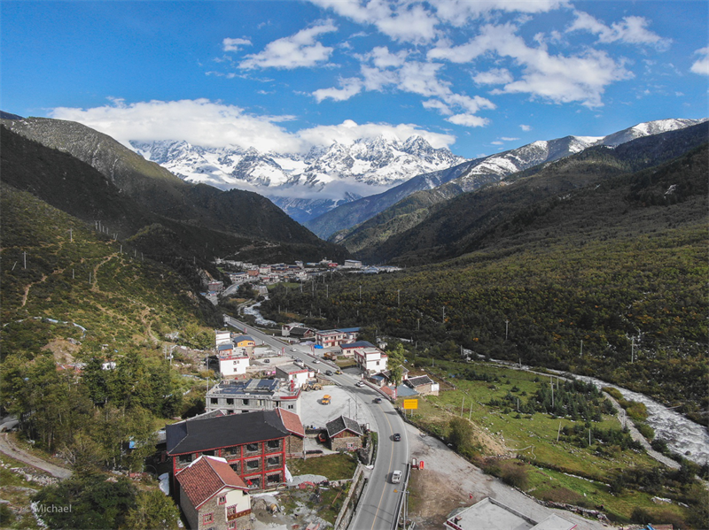 一路上,我翻过了四川巴郎山和折多山垭口,与雪山有了亲密接触。但是在大多数状况下,我们与想要拍摄的雪山都有非常远的距离。广角镜头在这种情况下几乎无法用来拍摄雪山特写照片,受限于电量和遥控距离,我们也不太可能让飞机往雪山的方向飞太远。此时,变焦镜头的重要性就凸显出来了,我完全可以轻轻拨动遥控器右侧摇杆,在基本不额外耗费电量的同时拍摄到较为清晰的雪山和村庄的特写「证件照」。由于畸变被控制得非常好,这种「证件照」也能更客观地呈现出乡村和雪山的全貌。