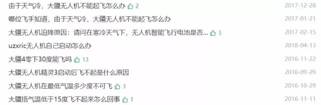 冬季电池续航时间变短是属不可抗自然现象,温度过低会使电池的效能和活性大幅度降低,从而影响无人机的正常工作。在北方或高海拔地区常会有低温天气出现,在南方的冬季仍然比较寒冷,飞行器是以锂电池为动力的,那么此时电池如果长时间在外放置,低温环境会使它的放电性能大大降低,电池容量会骤减,如果还要以常温状态时的飞行时间去飞,则一定会出现问题。记者发现,电池问题困扰了众多经验不足的飞手们,纷纷在网上求救资深飞手支招。(此图仅为部分,并未特指品牌)