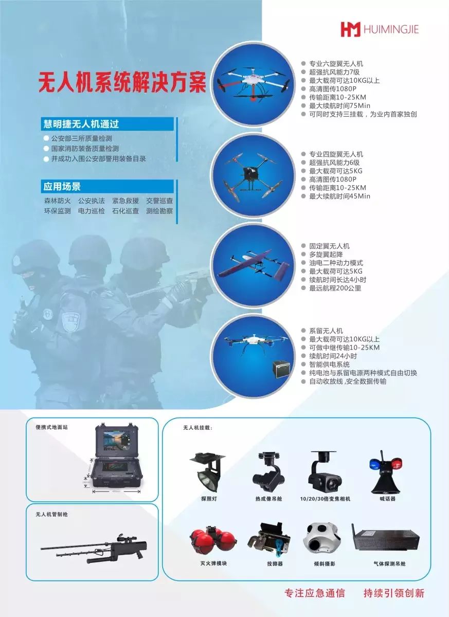 慧明捷携空地联动解决方案、无人机系统解决方案、4G高清图像传输解决方案、智能识别系统解决方案参与本届安博会,展示产品包括:多旋翼无人机、固定翼无人机、系留无人机、无人机反制枪、智能人脸识别/车牌识别设备、4G公网传输系统、无中心同频组网、无线图传系统、机动应急通信指挥调度系统等。