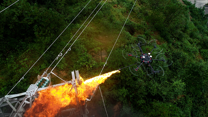 在220千伏洲苍线1线9号杆塔附近现场,只见一台无人机在众人的注视下缓缓升空,无人机操作手看着手中遥控器的屏幕,发现了挂在光缆连接金具悬挂着红色漂浮物(孔明灯),操作手操作无人机慢慢靠近也明灯位置,在屏幕上将准星对准悬挂着红色漂浮物,手指轻轻按下两个按键,一团熊熊大火便从无人机前端喷出,悬挂着红色的漂浮物立刻被点燃,过了不到一分钟的功夫,悬挂着红色漂浮物已燃烧殆尽。在岑溪110千伏探昙线2线12号塔现场,用上述同样的方法,江龙剑按动遥控按钮。在控制屏幕中看到,喷枪接收到遥控指令后,向异物喷洒汽油。当点火按钮按下,点火器喷出的火苗直窜蜂窝,马蜂窝开始燃烧。无人机手向着蜂窝再次喷火,余火便能将整个蜂窝烧尽,记者看到,从无人机起飞到异物燃尽,整个过程只需15分钟。