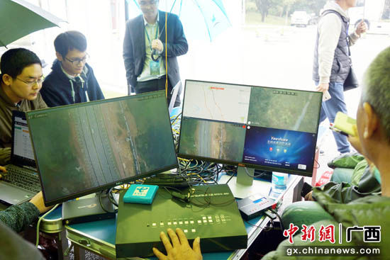 启动仪式上进行了无人机飞行巡检通信线路演示。演示先后放飞了两种不同型号的无人机,起飞点分别设置在桂林园博园梧州园现场和梧州园附近几百米处。飞行演示显示,迷蒙的细雨中,一号无人机在工作人员的操控下,从梧州园垂直起飞,盘旋一周后即转向阳朔县白沙镇方向,沿321国道的桂梧直埋光缆上空快速飞行,距开始起飞仅仅十几秒后,连接的地面接收系统就传来无人机在园博园上空航拍的高清画面,并通过十余台电视屏幕展示给全场嘉宾。二号无人机预先设定模拟为飞行中途因故障紧急返航,并在起飞点原地降落。一号无人机则飞完全程,在阳朔白沙镇郊外的预设降落点降落。两台无人机均使用中国电信4G网络进行飞行控制和实时数据传输,搭载高像素的相机沿321国道上空地表拍摄,无人机实时视频回传速率达23Mbps以上。40分钟后,两台无人机均按既定路线顺利完成起降及巡检任务。