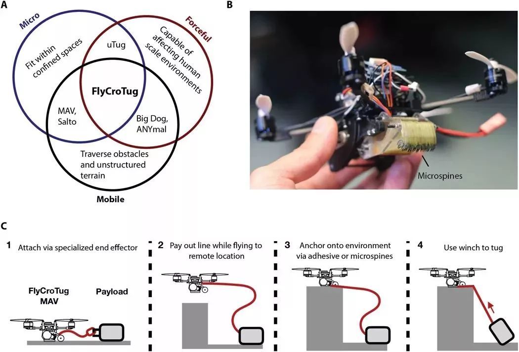每架重达100克的四轴飞行器都配有壁虎式粘合剂或类似于小鱼钩的微棘,帮助它附着在各种表面上。在将缆绳系在物体上后,无人机飞向目的地,将自己锚定在着陆地点,并使用机械绞车将货物拉入。这一系列事件使得无人机能够在飞行中运送太重的物体。