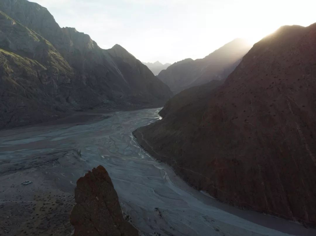 所以我把无人机飞得低了一些,此时巨石高大的侧面完整地展现了出来,而且背后的河滩和巨石的颜色亮度差别较大,巨石一下子就凸显了出来,显得十分高大。