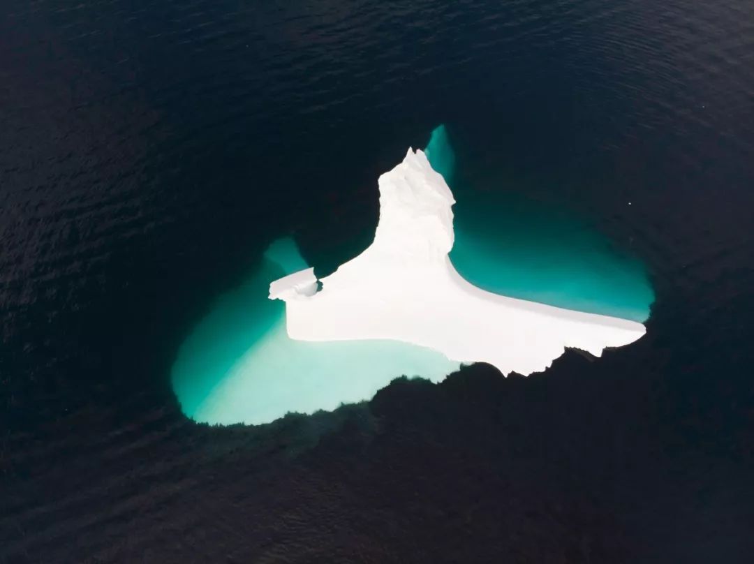 最后这张照片,我把无人机飞到一个适中的高度,正好可以同时拍到浮冰的顶部和侧面。斜视角度下,浮冰水底部分展现得更加全面。而且由于近大远小的透视作用,让浮冰前面显得更加夸张,富有冲击力。