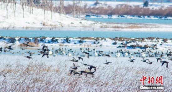 资料图:上千苍鹭、雁鸭、小天鹅等越冬候鸟在雪中飞舞,场面壮观美丽。 黄元国 摄