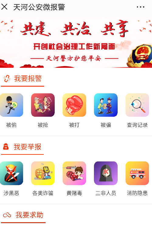 这是广州天河公安推出的微信一键报警功能,在“广州天河公安”微信公众号选择“微报警”,实名关注后一键选择报警类型,后台便会秒级回应并对警情全程跟踪。