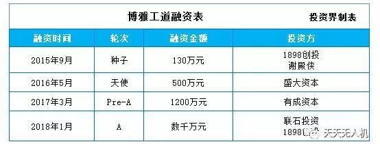 博雅工道(北京)机器人科技有限公司成立于2015年,是一家专注于水下机器人行业,集研发、生产与销售为一体的国家级高新技术企业。公司以北京大学十余年水下机器人技术成果为基础,自主研发了多款水下机器人产品,拥有80余项专利技术,客户涵盖军工、海洋装备、水运环保、消费电子等多个领域。博雅工道已完成多轮融资,详情见下表: