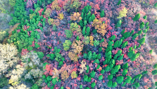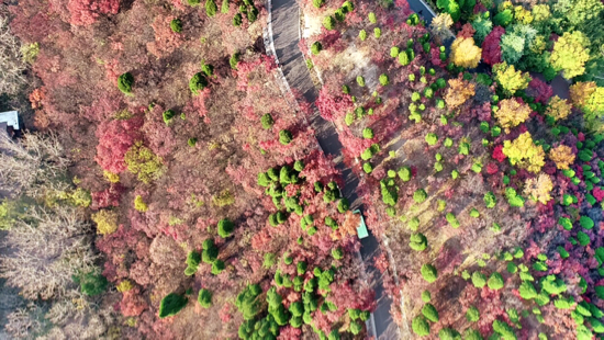 用无人机从高空俯瞰,山林如打翻了调色盘般,鲜艳的红、浓郁的绿交相呼应。看万山红遍,如置身于浪漫的梦幻世界。
