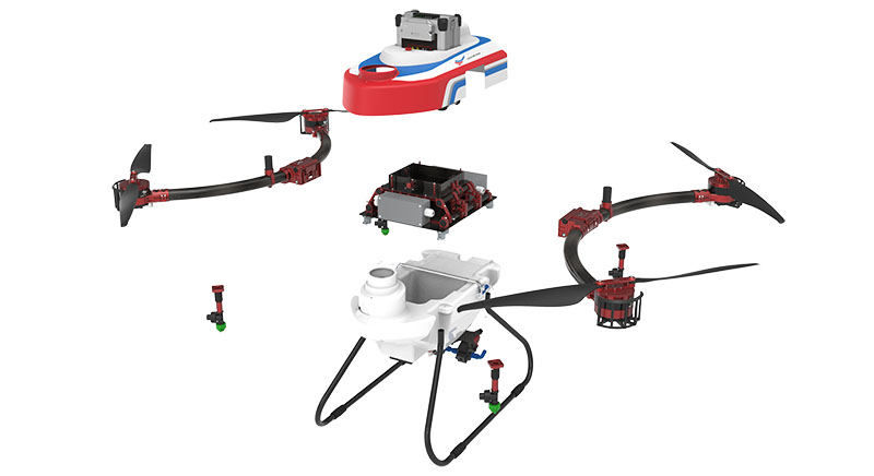 整机采用模块化设计,主要分为:脚架、药箱、机身框架、机臂、头罩,以便于日常拆装与维修保养,维修成本低;电池安装采用手提一键式快速插拔设计,2秒即可完成更换。