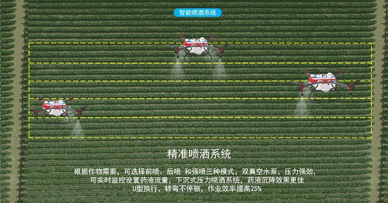 根据作物需要,可选择前喷、后喷和强喷三种模式,双真空水泵,压力强劲,可实时监控设置药液流量,下沉式压力喷洒系统,药液沉降效果更佳,U型换行,转弯不停顿,作业效率提高25%。