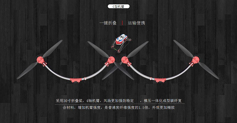 TY-M12L摒弃了传统四旋翼植保无人机的”x“与“+”造型,引进左右半环C形对称造型元素,赋予新型农用无人机科技感;流线型的线条设计,使得无人机在飞行过程中更为稳定;C型机臂与机身两点接触,一步式向下折叠收纳,节省空间,便于运输转场。