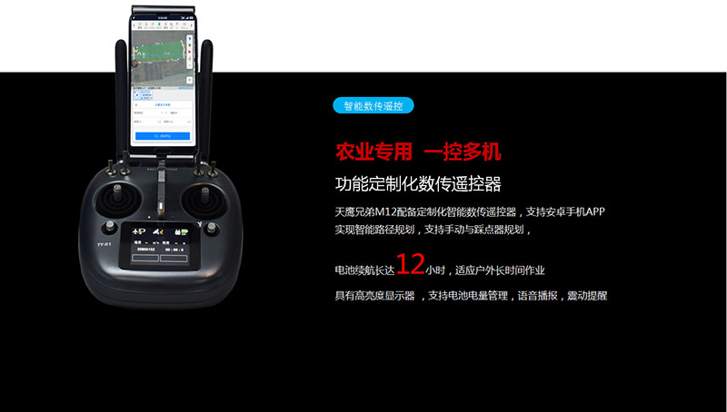 天鹰兄弟TY-M12L配备了定制化智能数传遥控器,支持安卓手机APP实现智能路径规划,支持手动与踩点器规划,电池续航长达12小时,适应户外长时间作业,具有高亮度显示器 ,支持电池电量管理,语音播报,震动提醒等功能。
