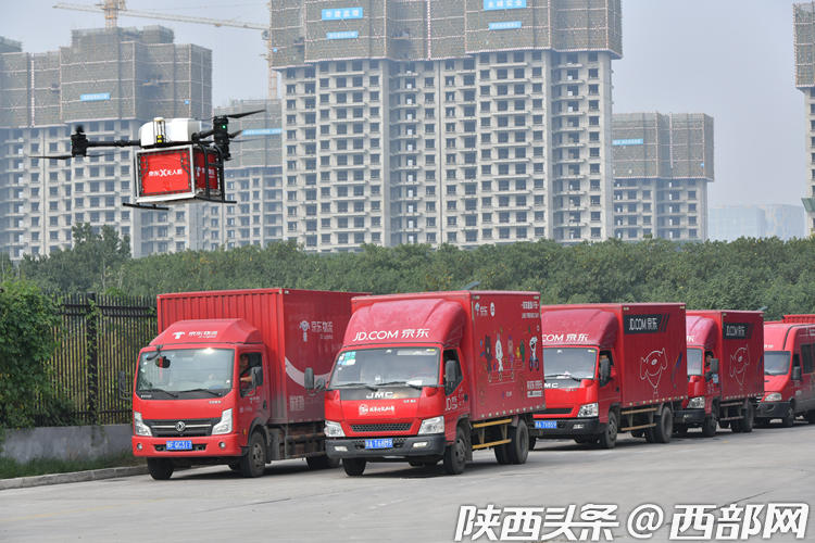 京东西北广汇分拣中心,无人机升空送货的同时,京东物流传站车辆正有序驶出,将包裹送向各配送站。