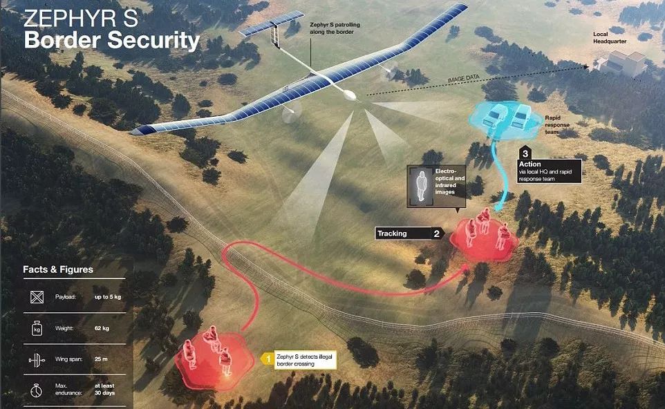▲由于具备超长留空时间,超高飞行高度多种优势,太阳能无人机十分适合执行对地侦察任务,图为英国“西风”-S太阳能无人机执行边境巡逻及对地探测宣传图。