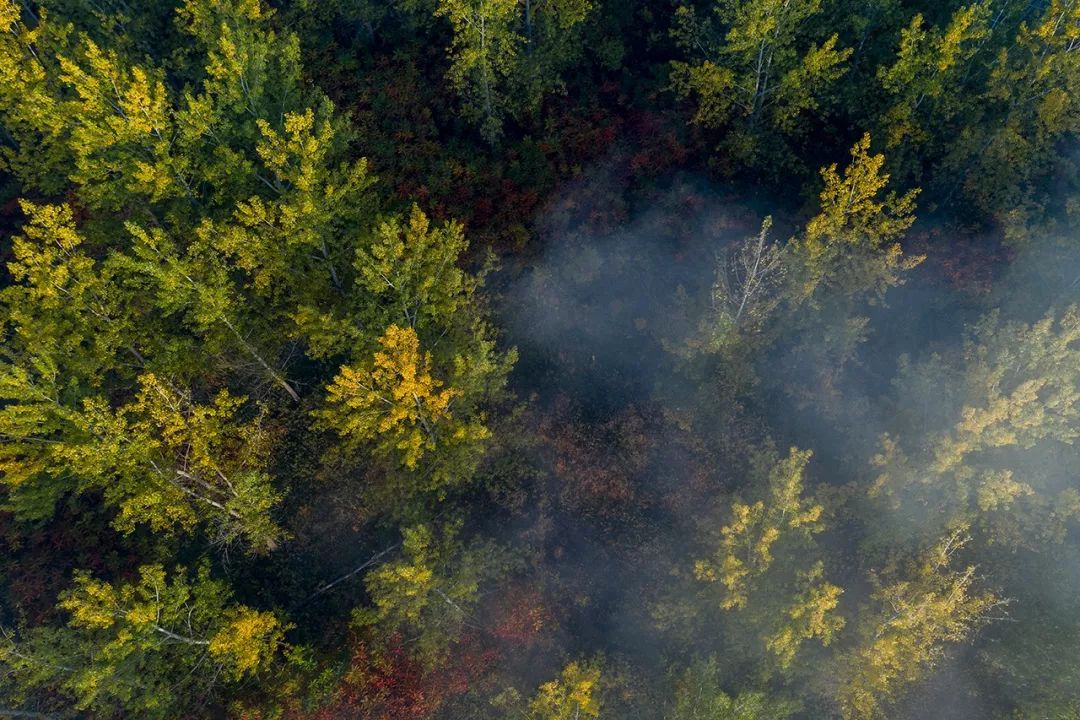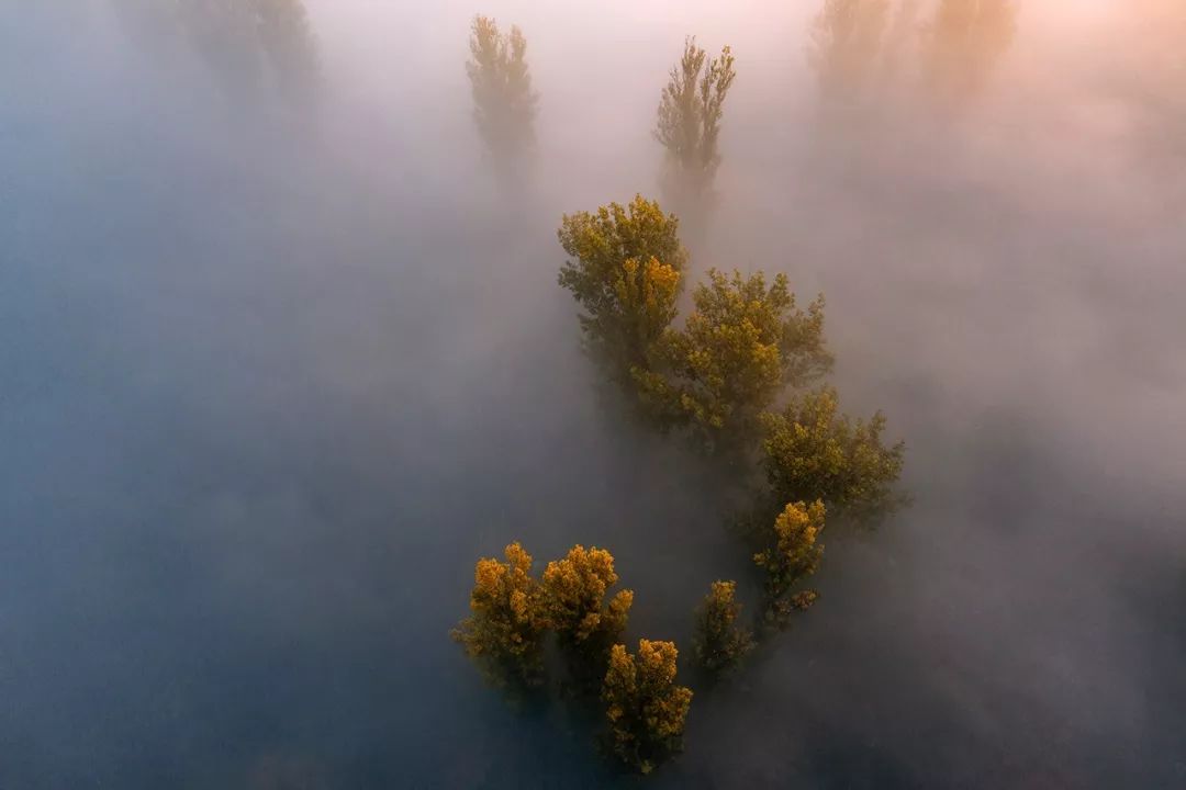 不同于那些场面恢弘的航拍大片,《秋雾》更像是一场诉说艺术与自然的演奏会,随着背景音乐悠扬的古典乐,画面给我们展现出秋雾弥漫下的魔幻的秘境。晨雾中行船的场面,在空中俯瞰水面犹如幻境,晨光中雾气倾洒林间,拍摄时画面的诗意感扑面而来,给作者留下了很深刻的印象。