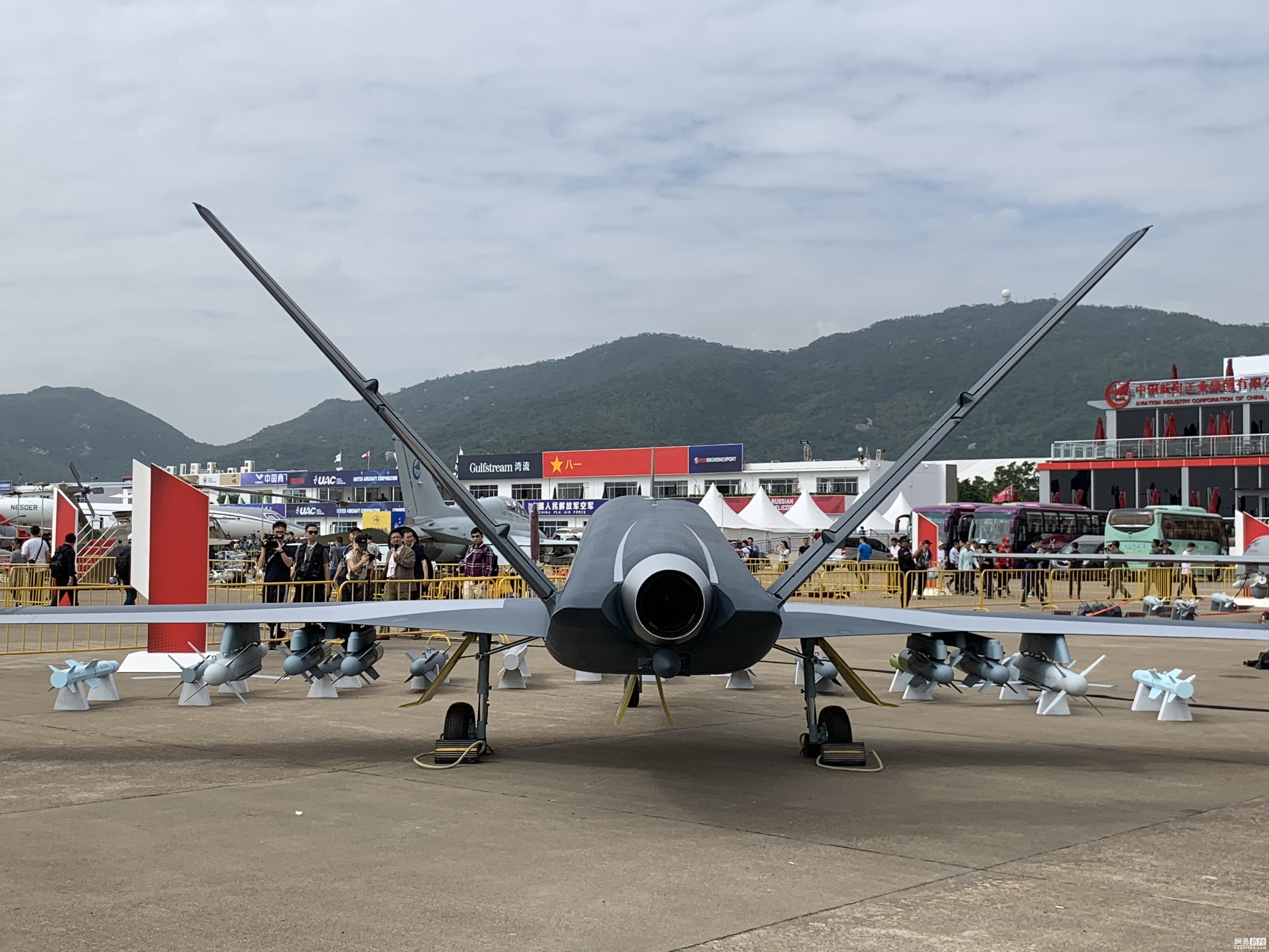 “云影”察打型无人机机翼下有4个挂点,最多可悬挂6枚武器,最大载弹珠海航展上“云影”无人机操纵台珠海航展上“云影”无人机操纵台量可达400公斤,可配挂50公斤/100公斤级小型精确制导炸弹、导弹,配装光电监视/瞄准装置及合成孔径雷达(SAR)。