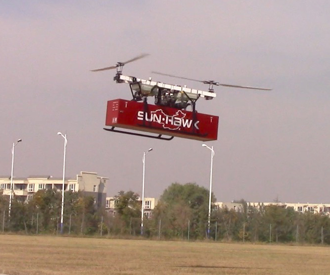纵列式双旋翼无人直升机由发动机、传动系统、机架、两个减速齿轮箱、两组浆毂、两组旋翼、两组倾斜盘、控制舵机、飞控单元、通讯链路、地面电台、地面工作站等组成。主要应用于物资投送、森林消防、农林植保、警务巡逻、电力巡线、灾害勘察、反恐等领域。