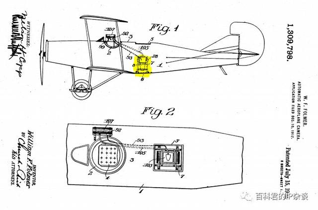 这篇1917年申请的美国专利,名曰“AUTOMATIC AEROPLANE-CAMERA”,你可以翻译为自动式的飞机照相机,那可不就是会飞的照相机么(标黄部分)?