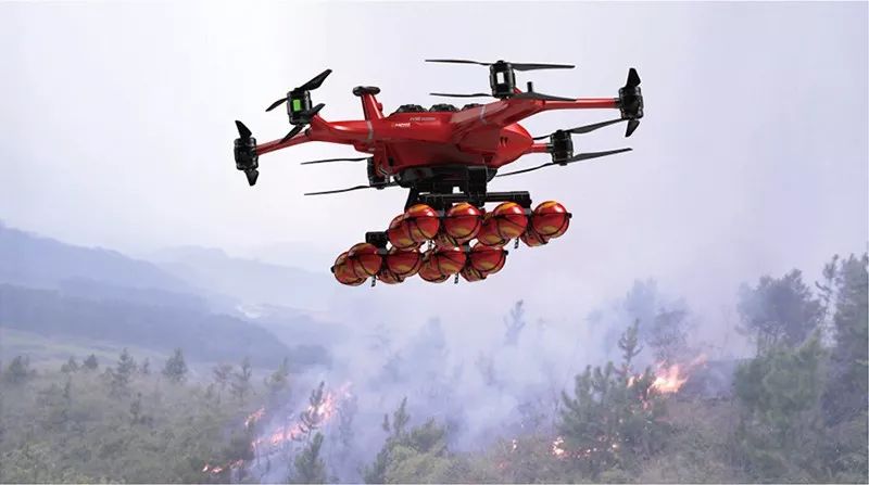 哈瓦救援无人机灭火弹系统:单驾次搭载16个灭火球,灭火面积可达100立方米。并同时喊话系统等其他任务模块。