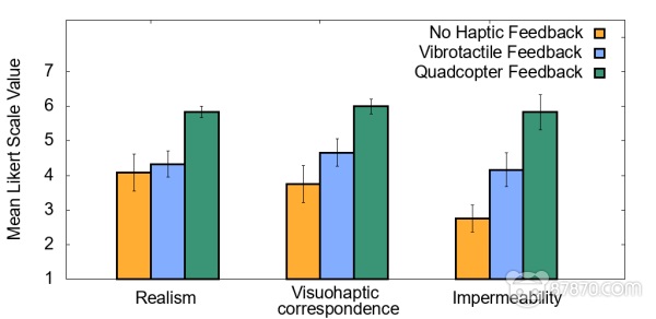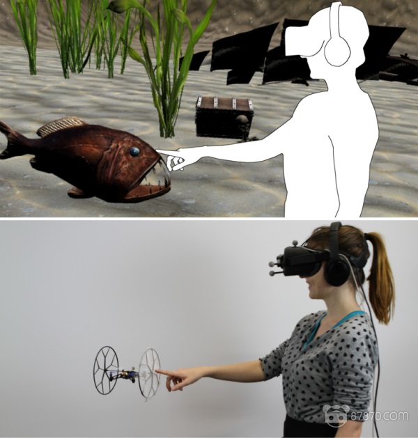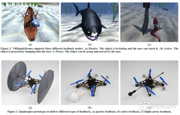 该团队的目标是提供三种类型的VR触觉反馈:被动、主动和定位触觉代理。为了帮助展示可跟踪四轴飞行器的功能,研究人员开发了一段的水下VR体验,展示了所有三种形式的反馈。体验在一个光线稀疏的水下环境中,这个环境完全由一个发光的球体进行照明。在探索环境之后,玩家可以伸出手并感受到球体的阻力,这是由被封闭的四轴飞行器在其VR对应物的精确位置上被动地浮动所提供的。