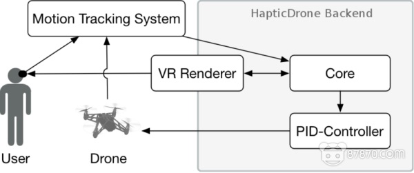 利用OptiTrack动捕系统的12个Flex 3相机覆盖的总空间大小为4米×4米×3米,VRHapticDrones系统能够跟踪VR头显、多个四轴飞行器以及用户自定义的身体部位,100Hz的采样频率让VRHapticDrones后端具有毫米级精度。安装在Oculus Rift头显前部的Leap Motion跟踪传感器可跟踪用户的手,使其能够与浮动的无人机自然交互。