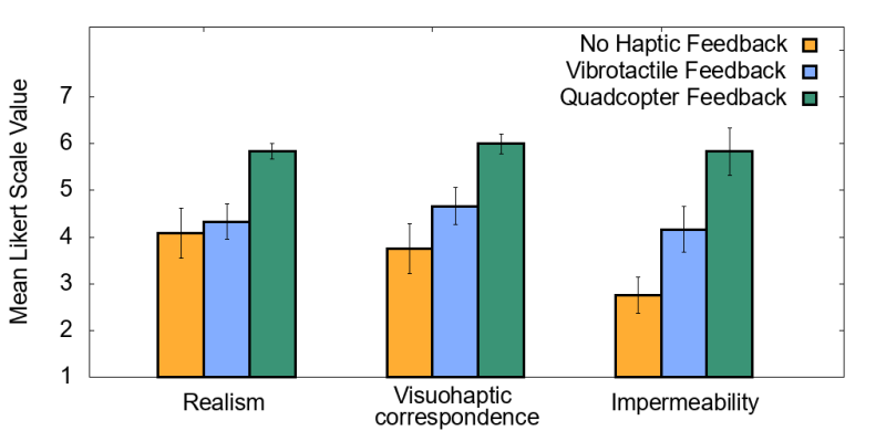 上述图表从真实感、视觉触感对应性和渗透性三方面对比无触觉反馈(黄)、震动式触觉反馈(蓝)和四轴飞行器触觉反馈(绿)的利开特式量表平均值。