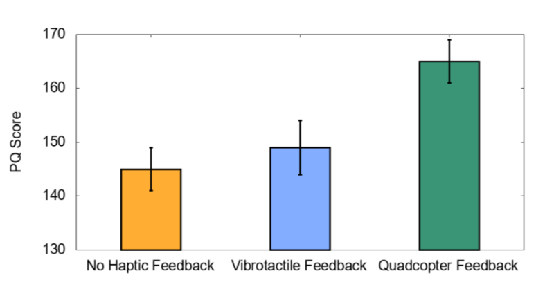 浸入感分数(从左到右:无触觉反馈、震动式触觉反馈、四轴飞行器触觉反馈)