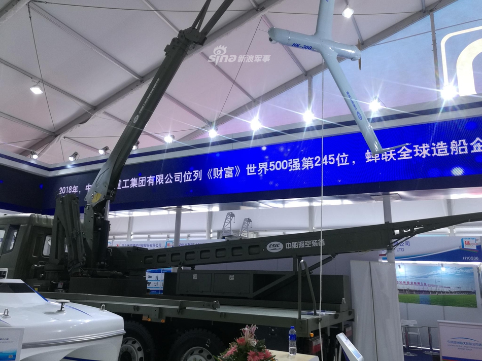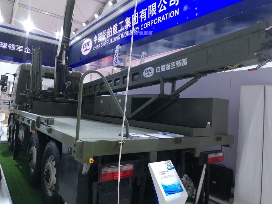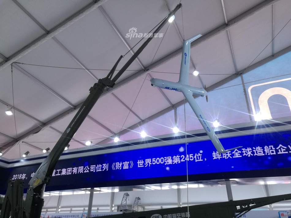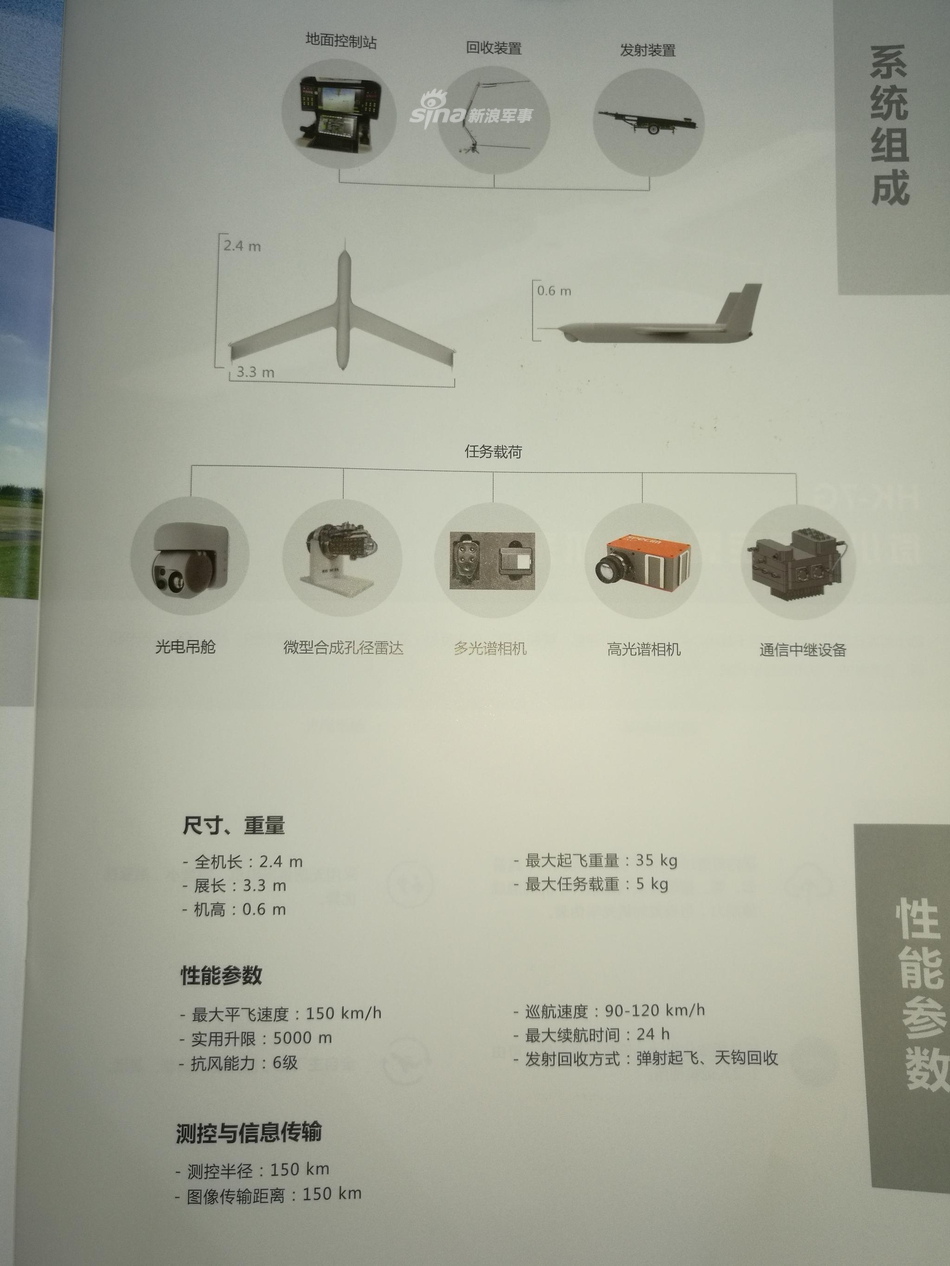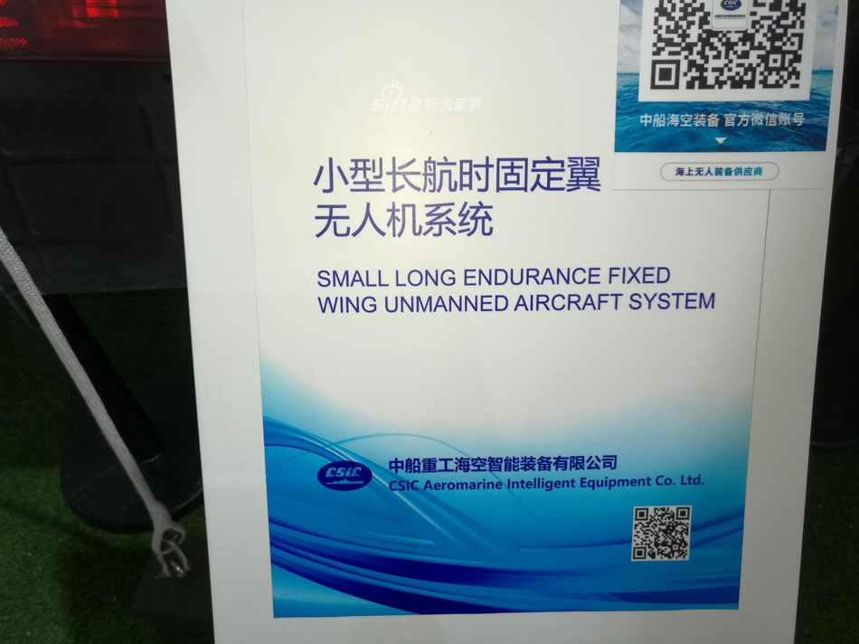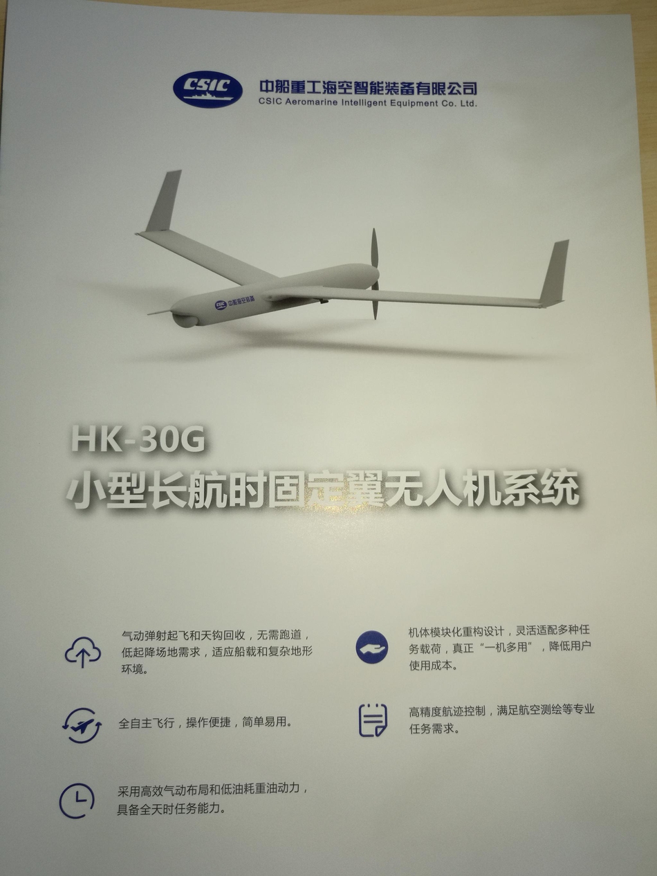 中船重工在本届珠海航展展示了一款类似美军“扫描鹰”无人机的小型固定翼长航时无人机系统。这款无人机采用弹射起飞,天钩回收的起降方式,适应舰载环境下无人机的使用。该机最大平飞速度150km/h,巡航速度90-120km/h,最大续航时间为24小时,实用升限5千米,测控半径150千米。