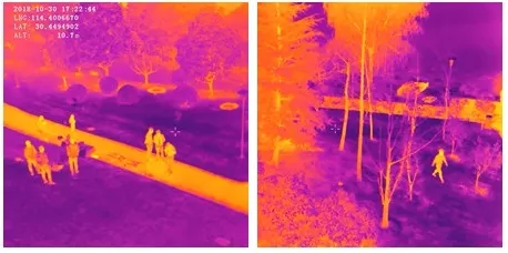 在夜间无光照或雾霾、烟尘等恶劣环境下,红外云台无人机可进行高空瞭望和勘查,具有穿透力强、测温精度高等特点,可精准识别隐藏目标,跟踪追查疑犯,监测能力尤为突出,大大降低了警力搜捕成本,减少了搜捕时间,已成为公安干警夜间打击罪犯的利器。