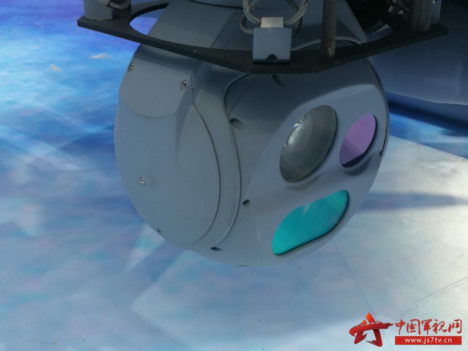 三光吊舱(其内置有可见光摄像机,红外摄像机,激光测距仪),相当于系统的“眼睛”,用于采集目标区域图像,发现目标后对其进行跟踪锁定,并确定目标的方位和距离信息,为系统对目标进行精确打击提供输入信息,同时使系统具有昼夜侦察打击能力。