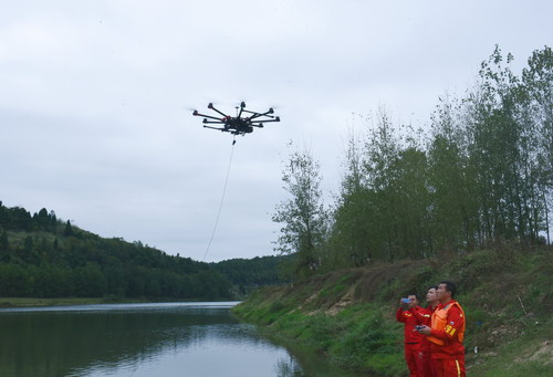 “1、2、3,拉!”在河对岸的放线人员和邓波团队的协同配合下,不到10分钟,无人机在河上空顺利地完成了往返。通过固定好的引线,放线人员轻松地将保险钢丝绳拉过河对岸。