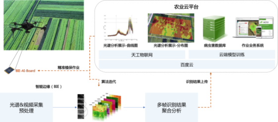 百度智能边缘和麦飞科技一起,将BIE-AI-Board(内置检测模型和作业模型)部署在无人机上,利用高光谱及可见光摄像头采集作物信息数据,将之上传至BIE-AI-Board,由BIE-AI-Board加载检测模型对作物病虫害位置、等级进行判断,并根据检测结果调用作业模型控制植保机执行植保作业,现该方案已在国内多块农田里开始实施。