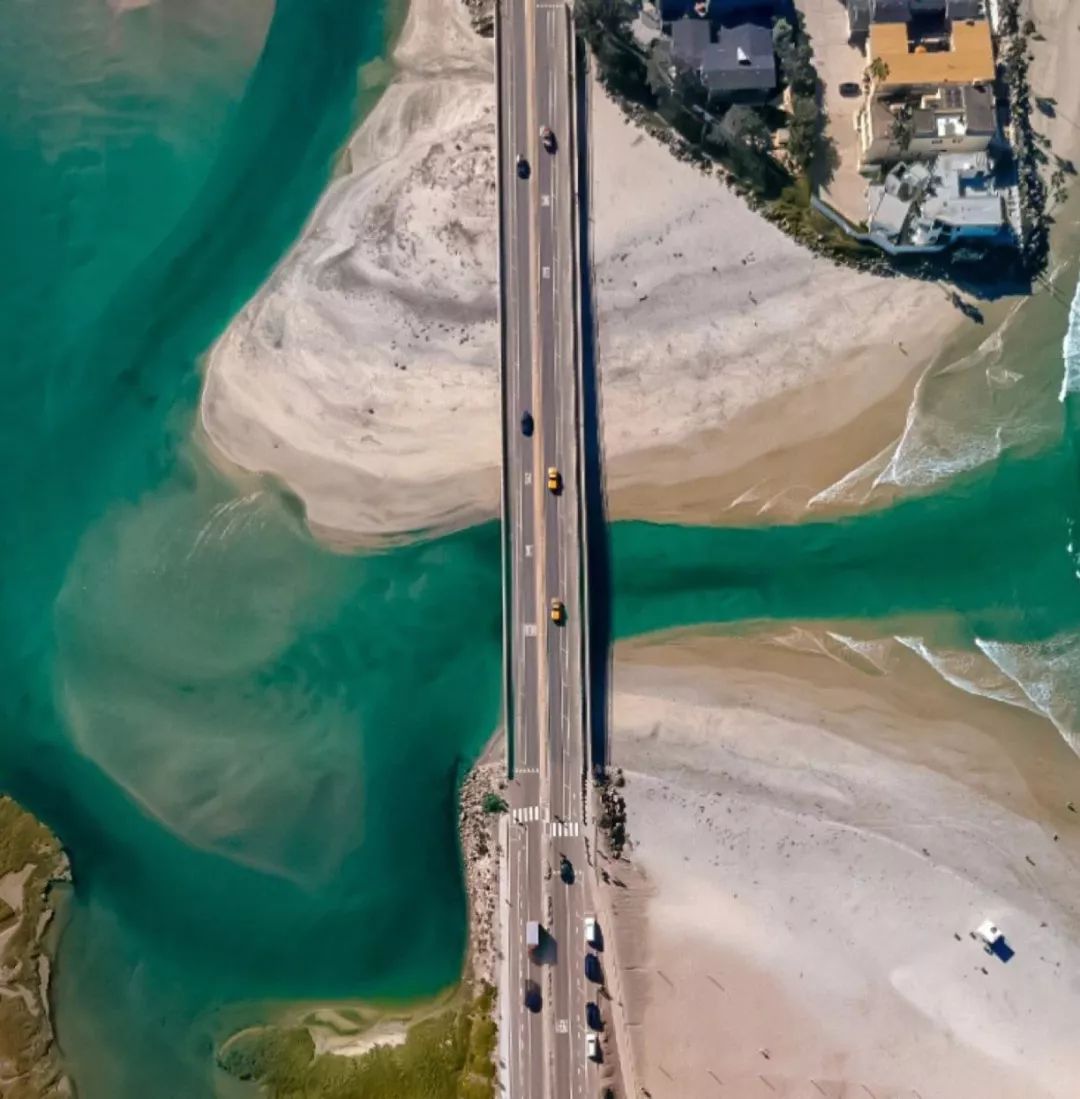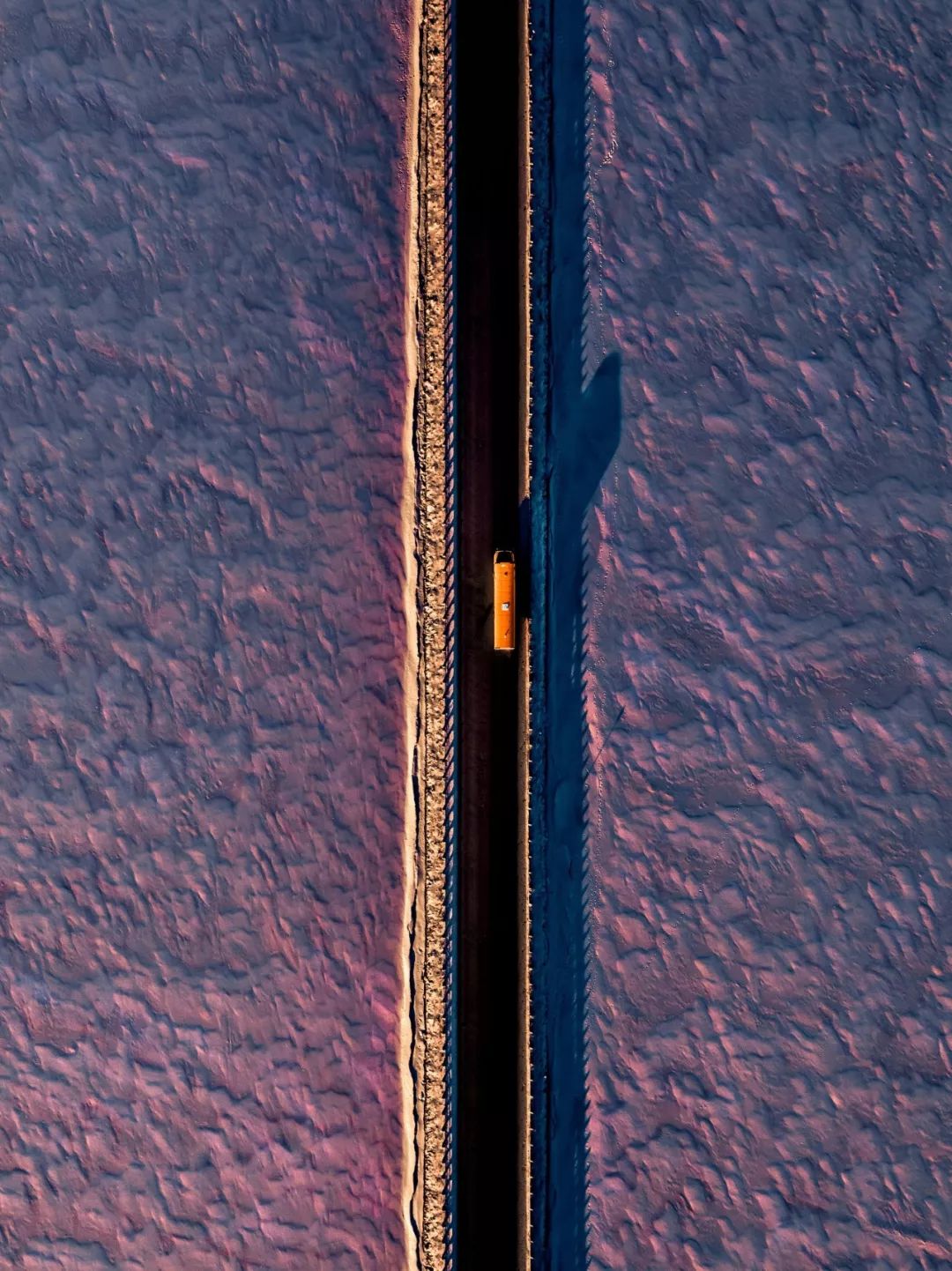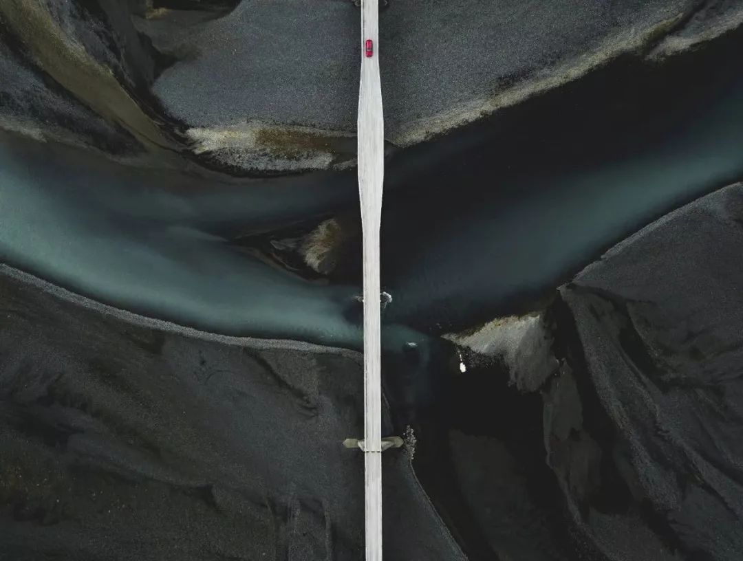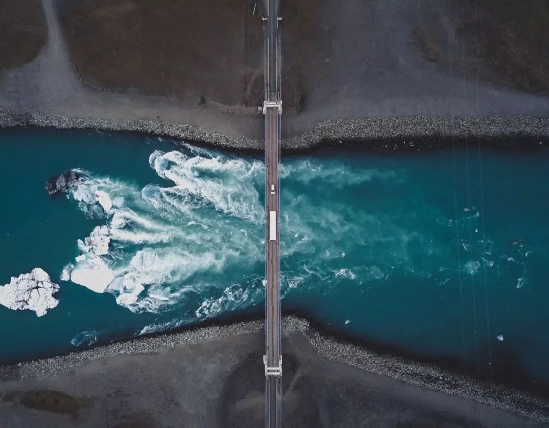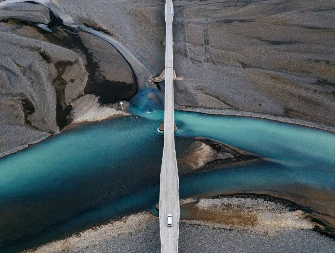 车辆一路往南,穿越了被初阳染成霞红色的雪原、青蓝相间的水坝,也穿越了布满水藻的湖泊。桥梁把这些风景都分成了对称的两半,道路在航拍视角下,也成了一种布局艺术。