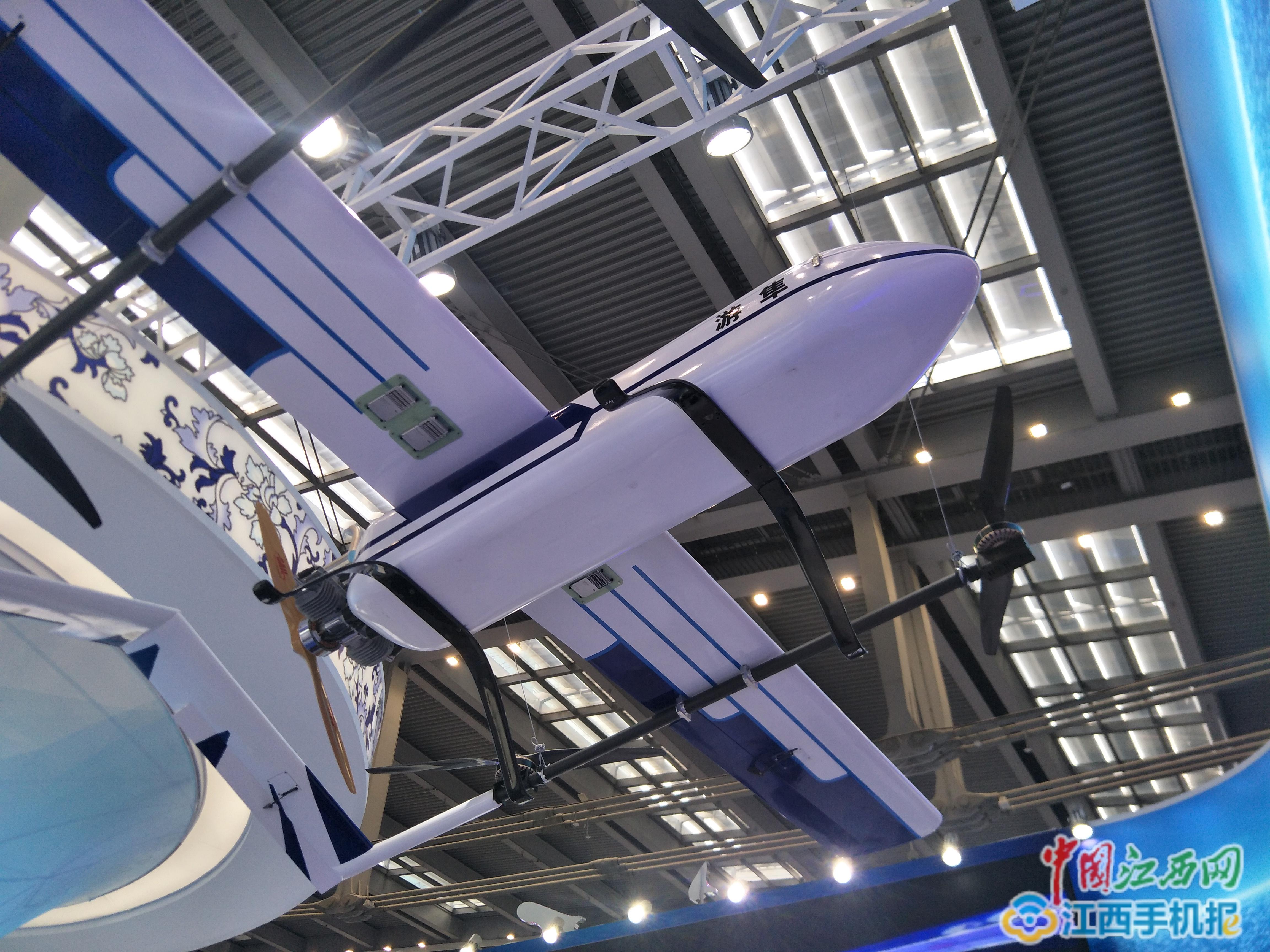 游隼是一种飞行能力极强的猛禽。在江西展区,一款展出的无人机以“游隼”命名,高悬在展区上方,白底蓝边的机翼如隼展翅俯冲,英姿飒爽。记者了解到,该机为混合多旋翼垂直起降无人机,一键起飞,全自动起降,自主作业,飞行高度最高可达6000米,速度在80-120km/h间,可用于岛礁侦查、电力巡线、输油管道巡检、森林防火、公安安全、反恐维稳、航拍航测等。