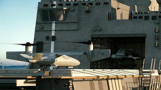 图片:美国贝尔V247无人机在两栖攻击舰上起降,注意也采用机翼外翼段和旋翼同步倾转的设计。