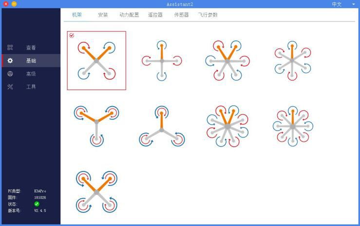 根据飞行器的情况选择正确的机架类型。