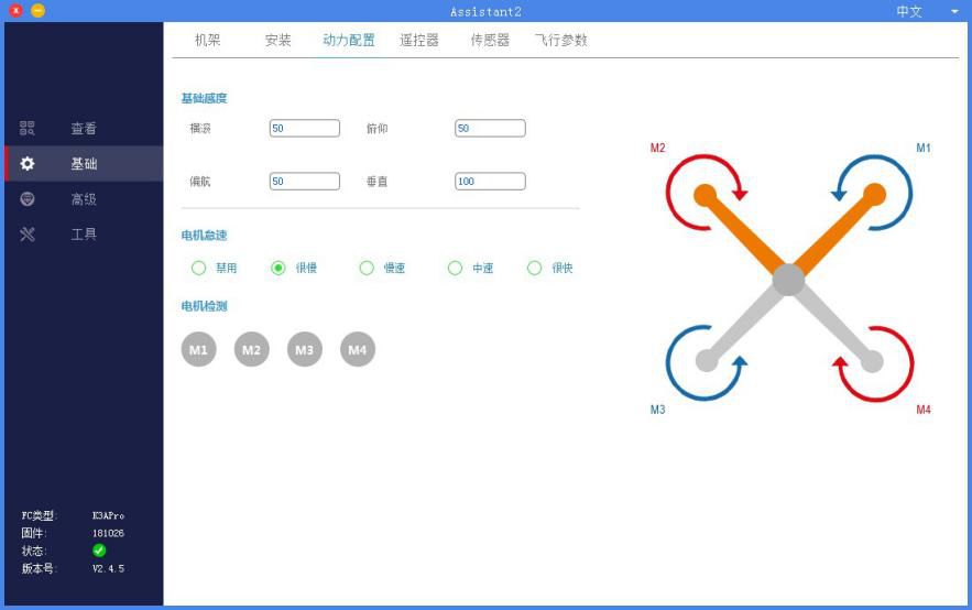 该界面用于选择飞行器的机架类型,同时对电机顺序和转向进行测试,确保电机安装无误。