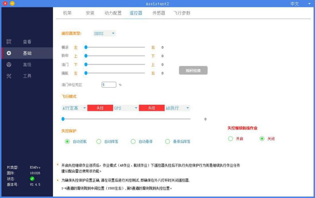 该界面用于设置遥控器的接收机类型,测试和校准遥控器通道,设置遥控器飞行模式以及失控保护。