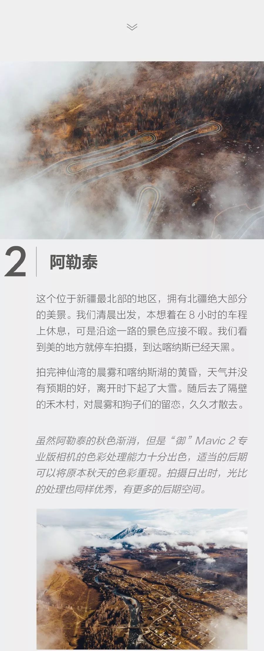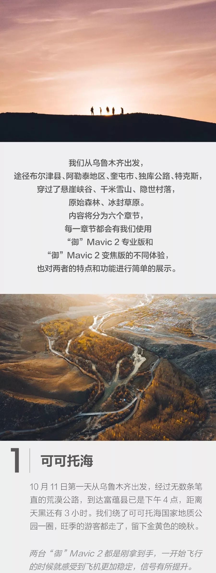 在这片神秘无垠的疆域,他们开启了为期 10 天,全程 4000 公里的北疆自驾游,期间分别使用“御” Mavic 2 专业版和“御” Mavic 2 变焦版航拍和手持拍摄,记录下这段公路之旅。