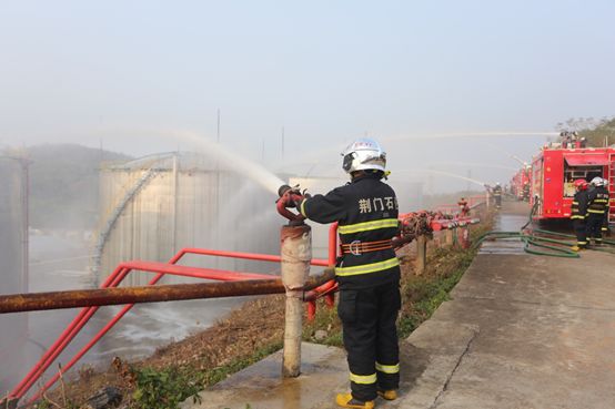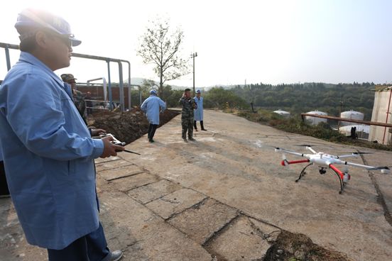 按照防空区域划分,荆门人防模拟一枚巡航导弹被防空部队拦截,接到荆门石化工厂报告,疑是导弹碎片物体击中了厂区的柴油罐,造成罐体着火,工人受伤。荆门人防指挥控制中心接到报告后,立即命令第三合成专业队迅速派出慧明捷无人机、通信、消防、防化防疫、医疗救护等专业队组成的救援队伍快速机动到达空袭区域开展空袭后果救援行动。