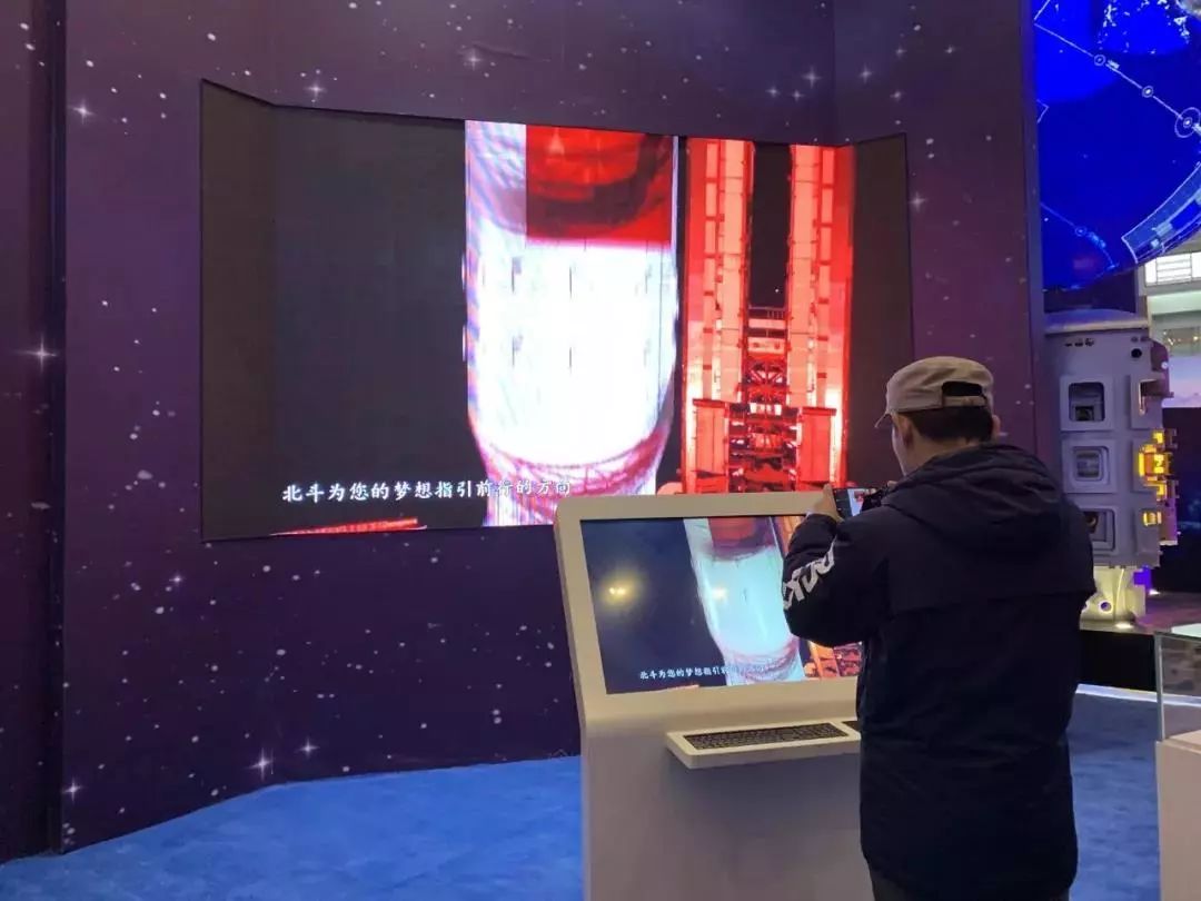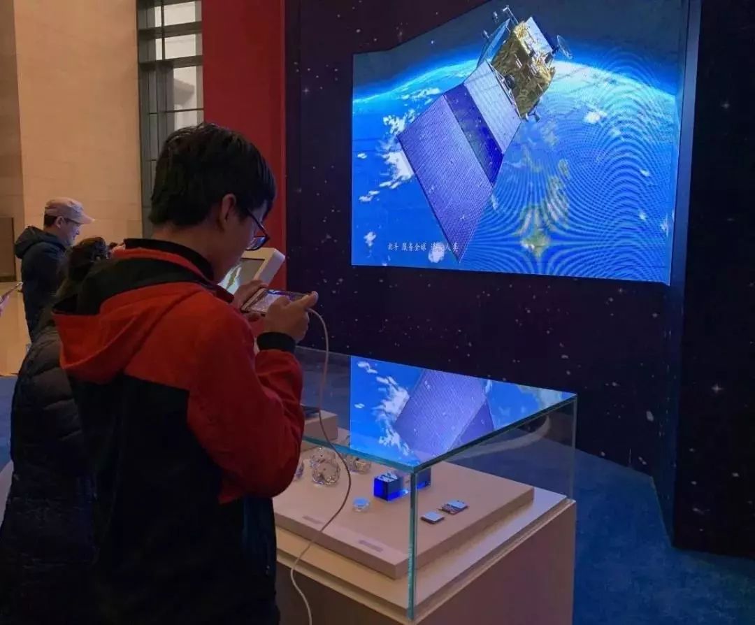 本次展览北斗系统共展出三方面内容。其中,北斗系统全球组网模型亮相于关键抉择展区中央,北斗系统基础产品及终端、以及互动大屏则亮相于壮美篇章展区中“勇攀科技高峰”单元。