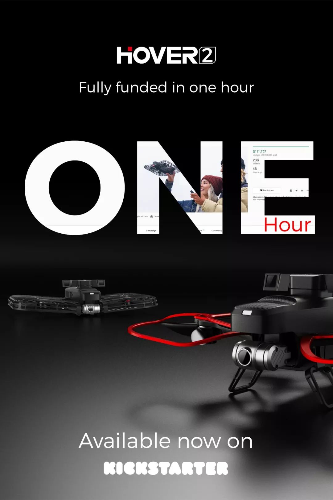 目前,Hover 2 默认发货颜色为经典黑色,一旦众筹金额超过100万美元,我们将提供透明设计款,届时将通过邮件联系您选择心仪的颜色。