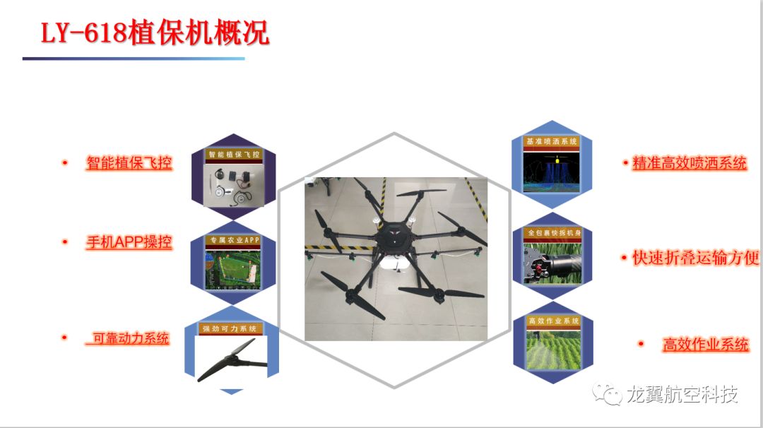 龙翼无人机凭借国内顶级的无人机专家团队和精湛的技术支持,经过长期市场调查研制出的LY-618植保无人机。该款无人机是具有优良性能的空中平台,采用智能化系统,具有自动起飞作业,自动降落、自动航线飞行、对农作物等高飞行、药量检测、记录断点,断点续喷、一站多机飞行、药量跟速度显示匹配等功能。
