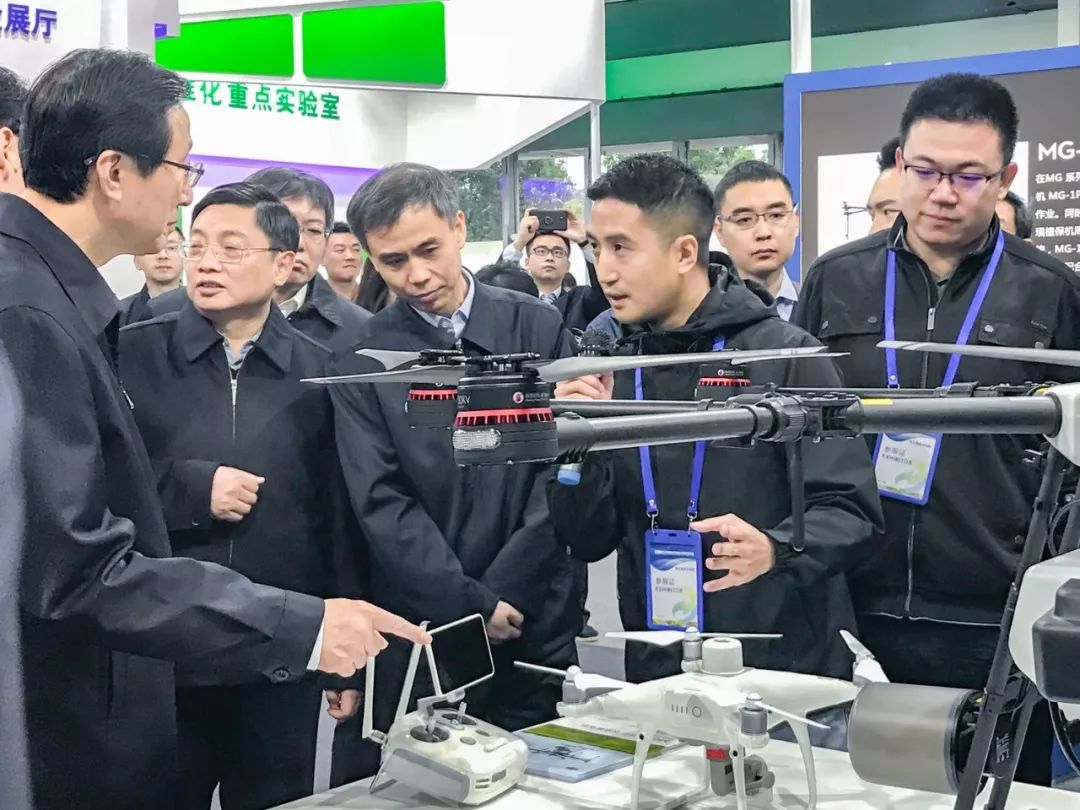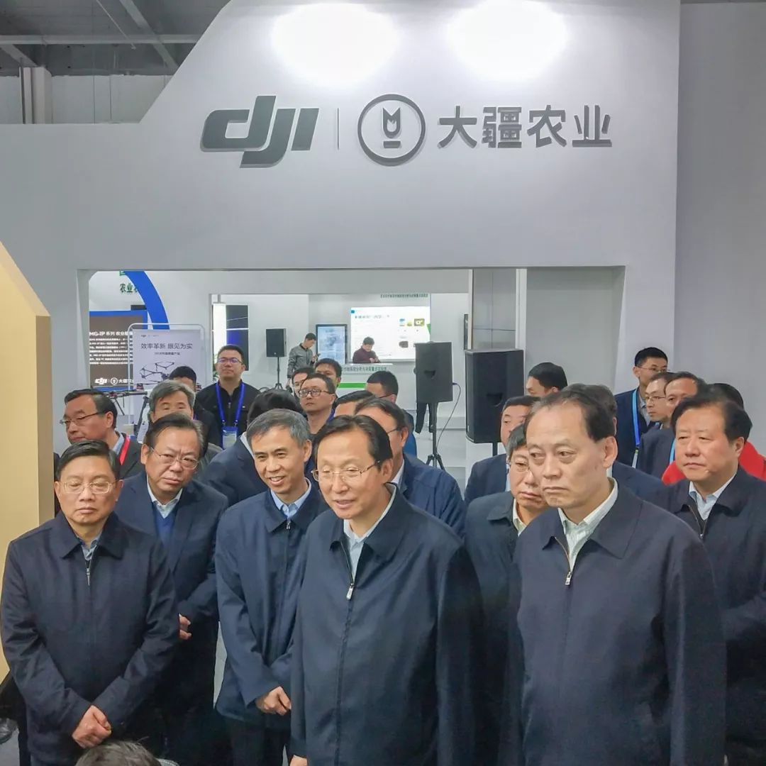 11 月 15 日,农业农村部党组书记、部长韩长赋,党组副书记、副部长余欣荣等一行莅临全国新农民新技术创业创新博览会考察指导,并在大疆农业展位参观了 MG-1P 植保人机,了解了大疆农业的发展状况。