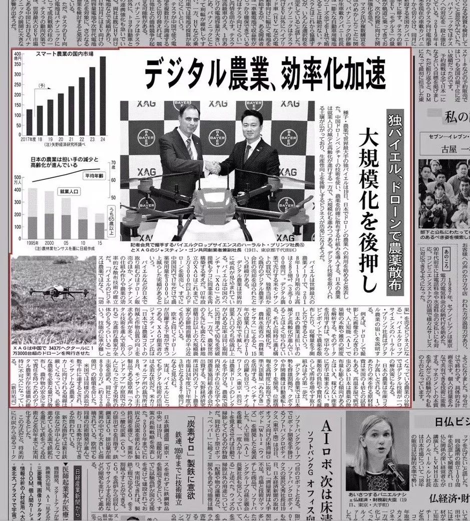 2018 年 11 月 19 日,拜耳作物科学株式会社(Bayer CropScience K.K.)与广州极飞科技有限公司(XAG Co., Ltd.)、极飞日本株式会社(XAIRCRAFT Japan K.K.),在东京签署了独家战略合作协议,协议三方将联合开展基于日本市场的无人机应用,为日本农民提供“定制化植保服务”,以满足日本农民及日本市场日益增长的需求。拜耳作物科学株式会社社长哈拉尔德 · 普林茨 (Dr. Harald Printz)博士、极飞科技联合创始人兼副总裁龚槚钦(Justin Gong)、极飞日本株式会社社长住田靖浩出席签约仪式。