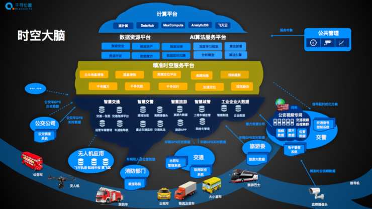 平台:主要包含高精度专有服务平台、AI算法服务平台、数据资源平台和计算平台,千寻位置的时空数据能力深度融合阿里云的城市大脑,塑造了“时空大脑+城市大脑”的效果,高效分析处理城市中的精准时间、空间数据。